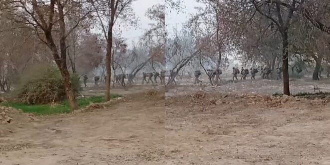يعرض الفيديو، البالغة مدته 9 ثوان، لقطات لطابور متحرك من الجنود بين الأشجار في منطقة زراعية مفتوحة.